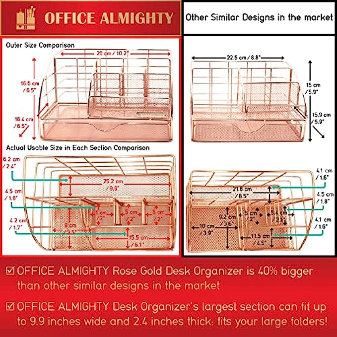 EXCLUSIVE 40% MORE SPACE: OFFICE ALMIGHTY 7 in 1 assembled Rose Gold Desktop Desk Organizer has 40% more usable space than similar designs in the market; The largest section fits up to 9.9 inches wide and 2.4 inches thick which fits your files, folders, letters, paper & notebooks; Besides, 5 separate compartments and 1 cute sliding drawer allow you to store most your stationary: pens, pencils, scissors, staplers, sticky notes and more in any arrangement you love; let your creativity run wild!