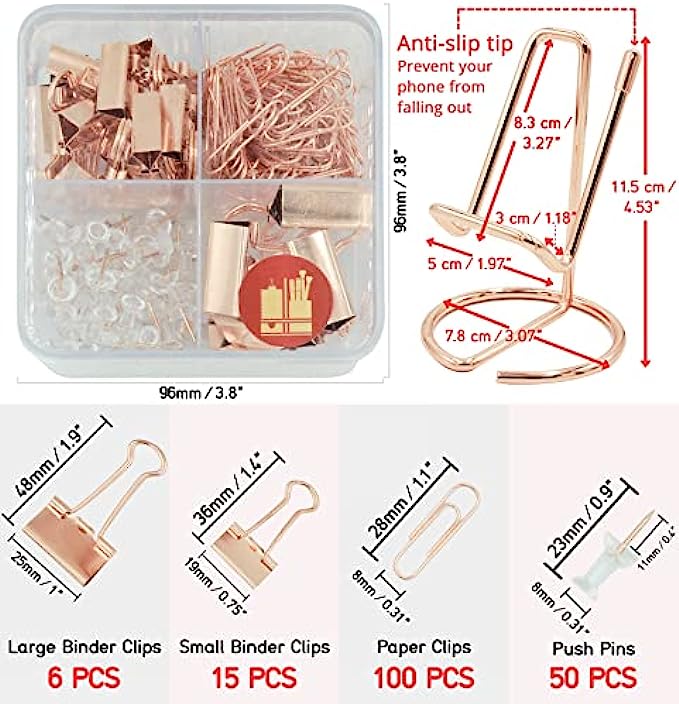 THE MOST COMPREHENSIVE DESK ORGANIZER SET: 40% Larger Rose Gold Desk Organizer paired w/ BONUS 171 Clips Set: 6 Pcs Large Binder Clips, 15 Pcs Small Binder Clips, 100 Pcs Paper Clips, 50 Pcs Push Pins; Stored in a reusable clear acrylic box to keep these clips accessible and organized; Also, an Ergonomic Design Phone Holder provides a perfect viewing angle with an extra-large base; All packed in an elegantly designed gift box; A perfect gift idea to anyone who works in an office and home!