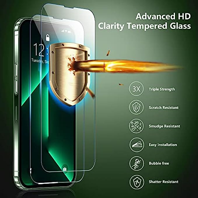 • [2 pcs Screen Protector&2 pcs Camera Lens Protector]High quality 9H Tempered Glass protect your iPhone 13 pro max screen from scratch and broken but ultra-thin, comfortable and sensitive touch make you feel as nothing on screen.Provide 2 pcs Tempered Glass Camera Lens Protector that can protect the camera 100% and will not affect the quality of the photo.
