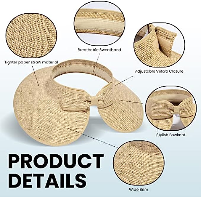 100% Straw Imported Hook and Loop closure Comfortable Sun Hat: This women sun hat with wide brim is made of high quality paper straw, light weight, breathable and comfortable, functional and stylish straw sun hat for women Wide Brim Sun Protection Hat: Fashionable and trendy designed straw hat, this beach sun hat for women has a wide brim for blocking out the sunlight, gives you great sun protection all over the face and neck, helps you cool in the sun Adjustable Summer Hat: Adjustable head circumference about 22"-23.2" to fit your head size; It is also suitable to wear even with various hair styles. With this topless ponytail straw sun visor, it is easy to throw your hair in a messy bun or ponytail, no more muss of your hairdo Packable Hats for Women: This packable straw sun hat features a roll up function, incredibly convenient as it is foldable for easy storage or for taking on the go while traveling, easy to keep it in your bag or suitcase, still keep its shape when any time you take it out Functional Beach Hats for Women: This beach hat is features with wicking sweatband to keep you super comfortable, and this straw hat is perfect for beach, pool, park, outdoor shopping, fishing, gardening or any other outdoor sports and activities