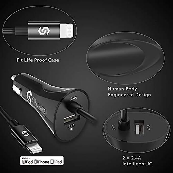 I-smart design - the combination of lightning cable and additional USB port allows Syncwire Lightning car charger Charge any two devices simultaneously with max up to 4.8a output, and it automatically adapts the output to each one accordingly.