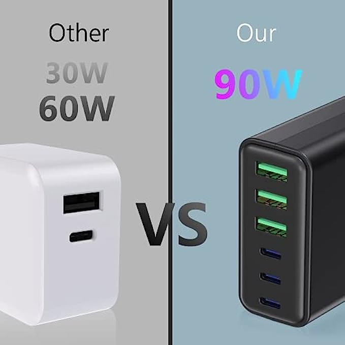 【Fast-Speed Charging】 It with total Design Power 100 watt. total output power 90W. 3x20W USB-C Power Delivery port for iPhone 13/12/12 Pro/12 Pro Max, iPhone 11/11Pro/XS/XR/X, iPad Pro, iPad Air, Galaxy S10 / S9 and other Samsung phones and tablets, more up to 3× faster than with an original old charger. 3 X10W USB A fast charger port for your other devices