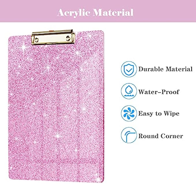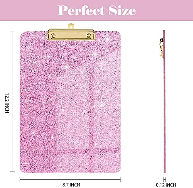 Package :1X glitter acrylic pink hardboard,12.2 INCH x 8.7 INCH; It can hold letter size paper sheets (standard 8.5" x 11"), letter sized clipboard, golden low profile metal clip, retractable key hole.