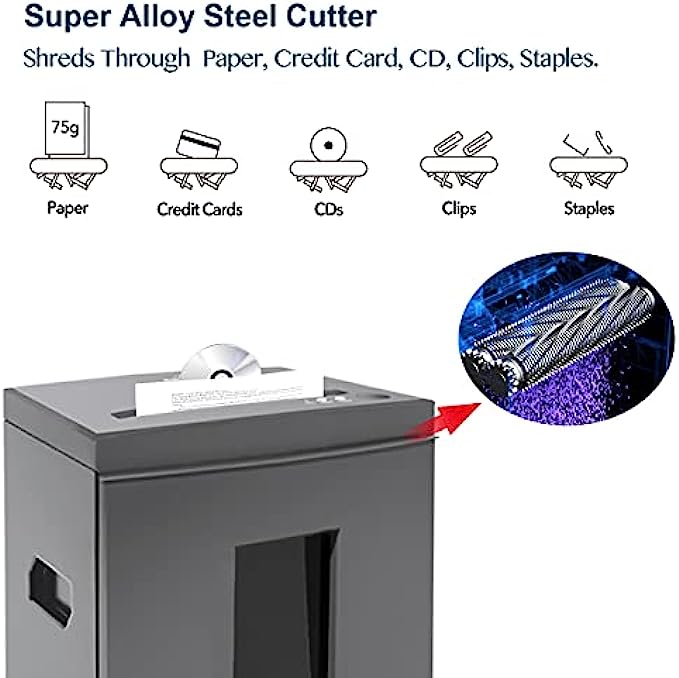CROSS-CUT SECURITY LEVEL P-4 to secure confidential information. Shreds max 18-sheet paper/staples/clips into particles measuring 5/32" x 1-3/8" (4mm x 35mm); also shreds CD and Credit Card. The blades will cut each disc into three pieces