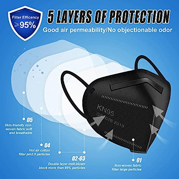 • 【5-Ply Protective Layer】KN95 face masks are made of two layers of non-woven cloth, two layers of melt-blown fabric, one layer of hot air cotton. Inner skin-friendly layer absorb the moisture from the breath, 5-ply KN95 mask is designed to offer more protection than a standard disposable 3-Ply mask.