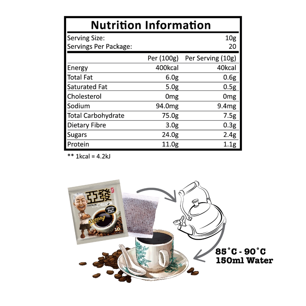 Form:Sachets Aroma:Nice Quality:Good My fav kopi-o fix at home, rather strong & aromatic, comparable to coffee shop kopi. Use less hot water if want it gao, cheap & good