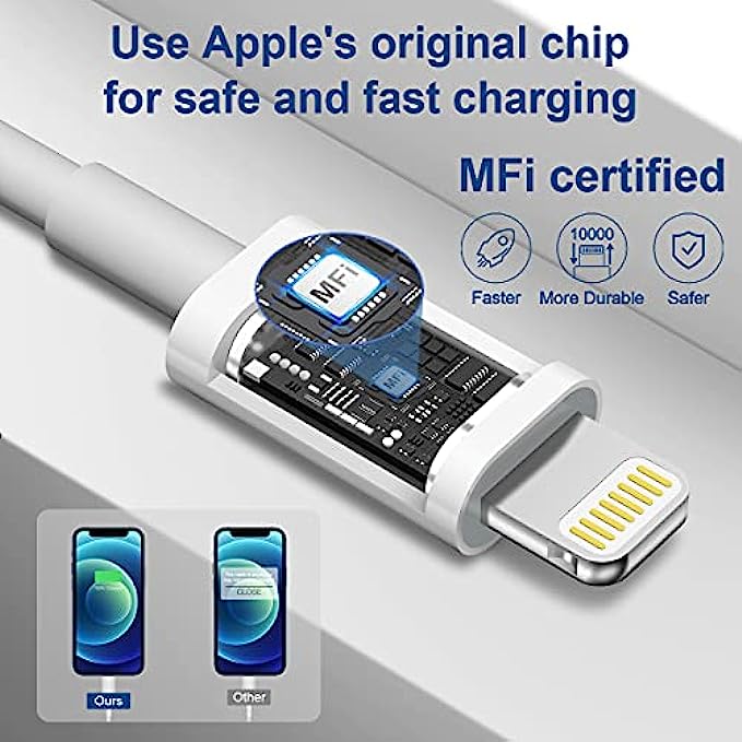 [Apple MFi Certified Lightning Cable]With the Apple MFi Chip, the USB-C to lightning cord equips automatic chip recognition function, full support with iOS versions.20W USB-C Charger Offers Multiple Safeguards Automatically. Multi-Charging Protection Keeps Your Device Safe From Over-Current Over-Voltage Over- Heating & Short-Circuiting.