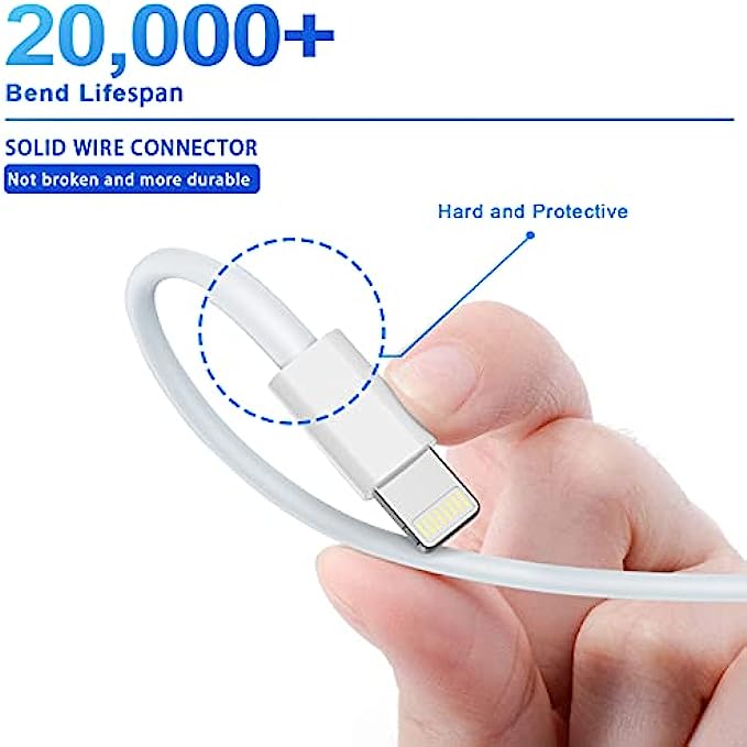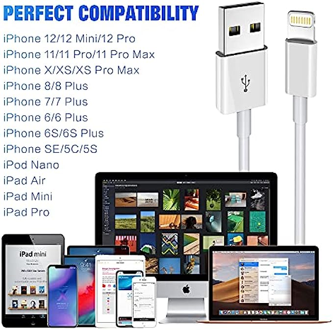 • 100% Perfect Compatibility:Our iPhone USB lightning cables works seamlessly with any new iPhone iPad, including iPhone 12 iphone 11 Pro Max SE X XS XR 8 8Plus 7 7Plus 6S Plus 6 5S 5C 5, iPad air mini pro, iPod, Airpods and more. Compact lightning connector head design ensure that the iPhone charger cable fit most phone cases and accessories.