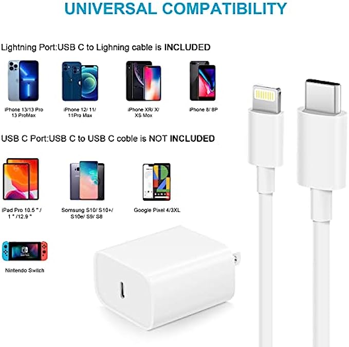 【Applicable Apple Equipment】 Use the official iPhone lightning cable with INCORIC 20W USB C wall charger to access fast-charging for iPhone 13/13 Mini/13 Pro/13 Pro Max/12/12 Mini/12 Pro/12 Pro Max/SE 2020/11/11 Pro/11 Pro Max/XS/XS Max/XR/X 8 Plus, iPad,iPad Pro iPad mini iPad Air.This INCORIC Power Delivery 3.0 Fast charger also charge for iPhone 7 6 Plus, iPhone 5 5c 5s SE Airpod in a original charging speed.