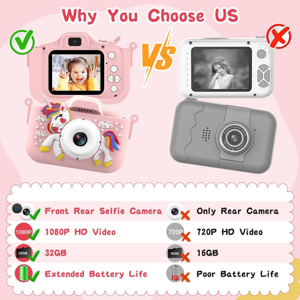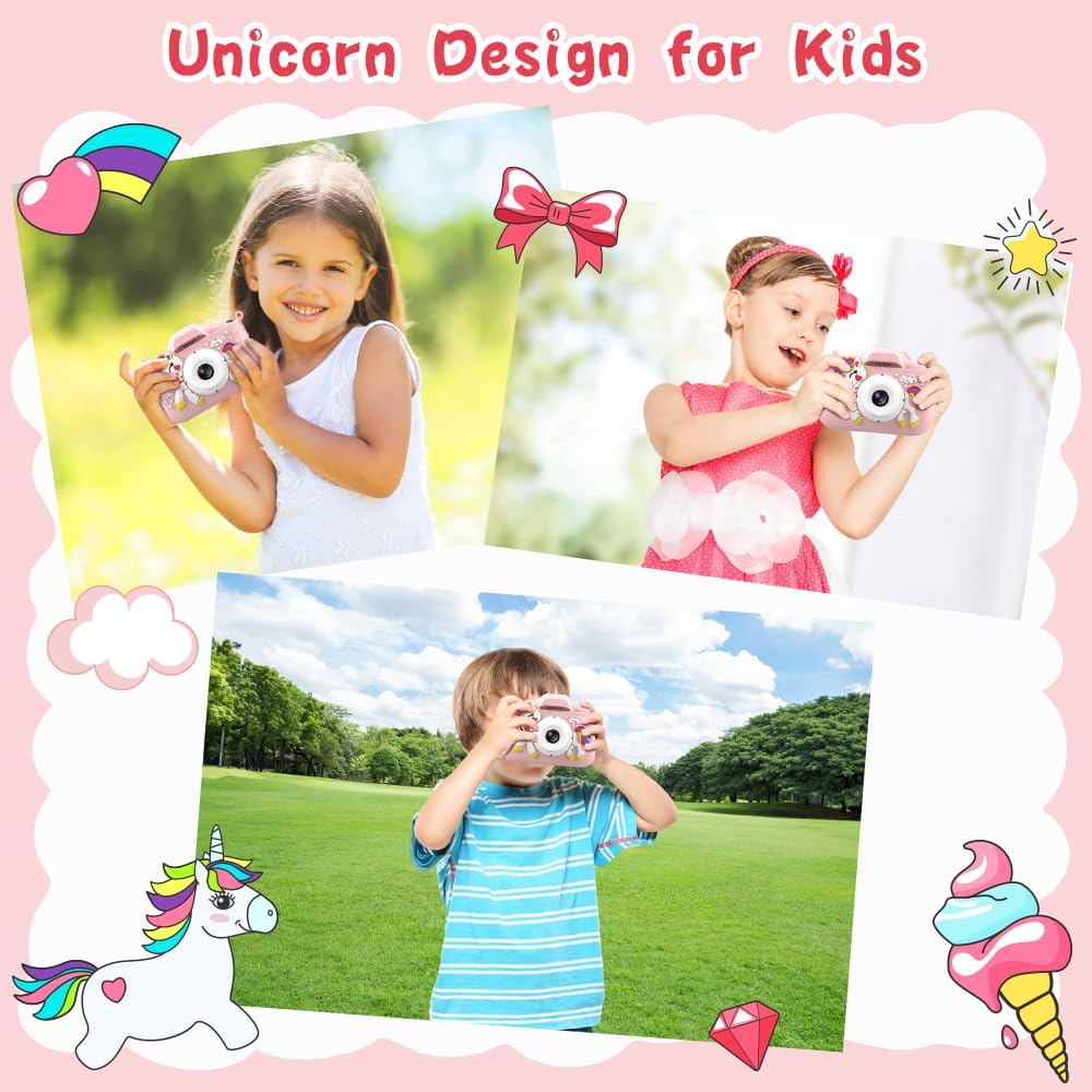 Kids Camera, 1080P Kids Digital Camera with 32GB TF Card,Unicorn Camera Cover/HD Video /5 Educational Games/8x Zoom/46 Photo Frames & Filters,Gifts for Boys Girls Age 3-8 (Pink)